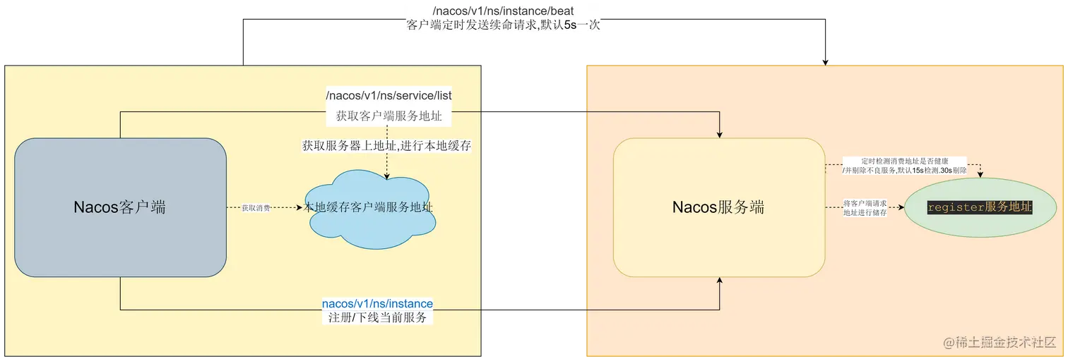 注:客户端向服务端每隔5s向服务端发送心跳请求,进行服务续租,告诉服务端该实例IP健康。若在3次心跳的间隔时间(默认15s)内服务端没有接受到该实例的心跳请求,则认为该实例不健康,该实例将无法被消费。如果再次经历3次心跳的间隔时间,服务端接受到该实例的请求,那么会立刻将其设置外健康,并可以被消费,若未接受到,则删除该实例的注册信息。推荐配置为5s,如果有的业务线希望服务下线或者出故障时希望尽快被发现,可以适当减少该值。
