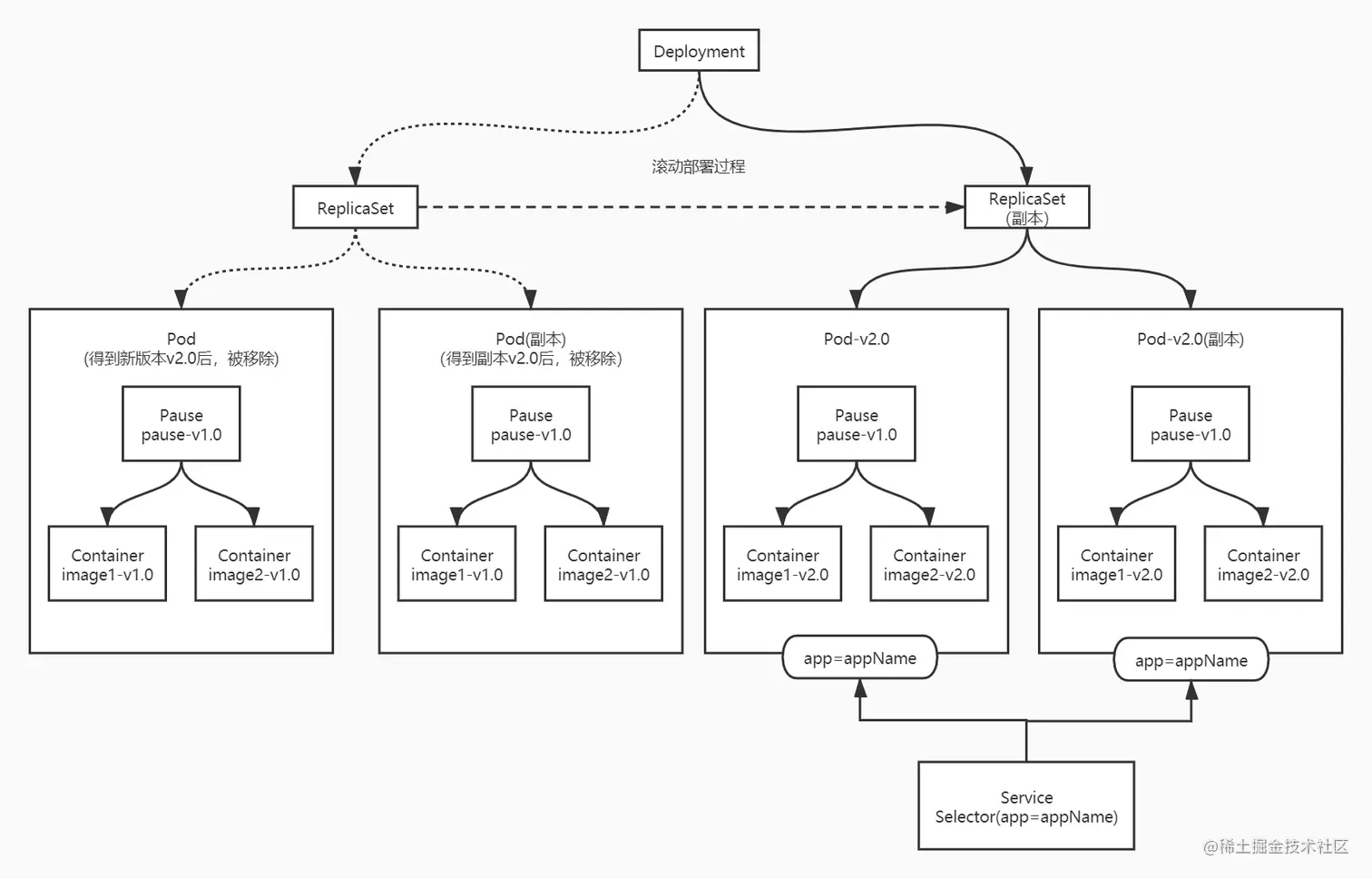 Deployment 是 ReplicaSet 的上级,负责 ReplicaSet 的创建和销毁,管理 ReplicaSet 并提供很多有用的特性,最重要的是 Deployment 支持声明式更新,声明式对比命令式更新的优势在于不会丢失历史变更,可以通过 Deployment 实现滚动部署。