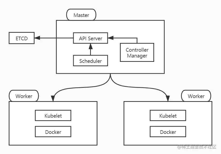 K8S 使用主从架构,内部的节点分别主节点 Master 和从节点 Worker ,Master 负责管理 Worker 节点,K8S 使用 ETCD 做存储,用于节点和服务信息的管理,持久化地存储这些信息,保证数据不丢失,可以进行服务的恢复。
