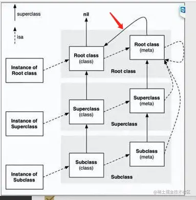 注意上面的红色的箭头,当找不到元类对象的父类的时候,就会指向当前这个类,而root class很明显就是NSObject,