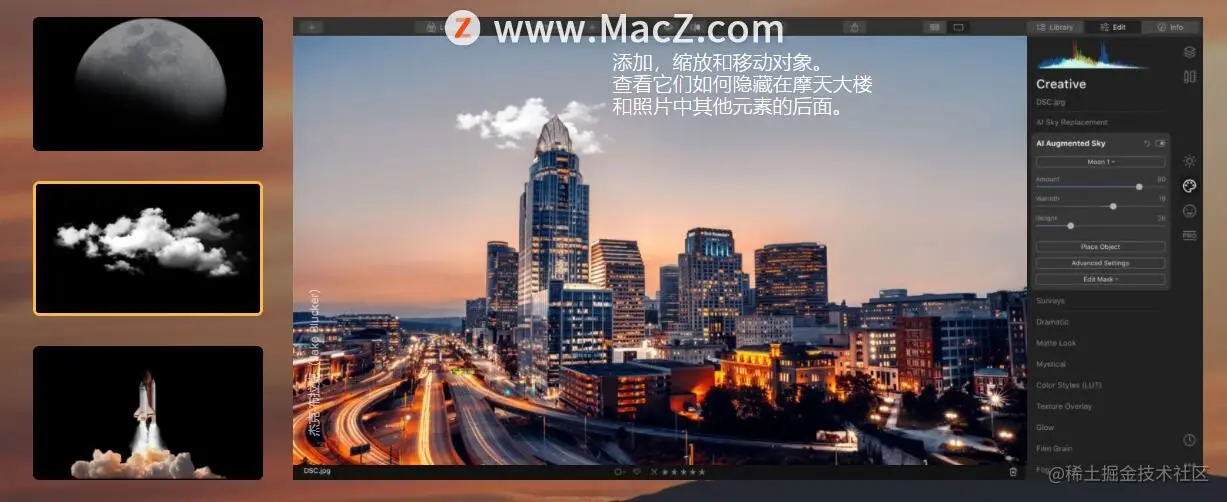 **使用AI增强天空工具 轻松地在图片中插入新对象。**一次点击即可嵌入新对象,在数十种预安装的对象中进行选择或添加自己的对象。将它们轻松嵌入到您的照片中。