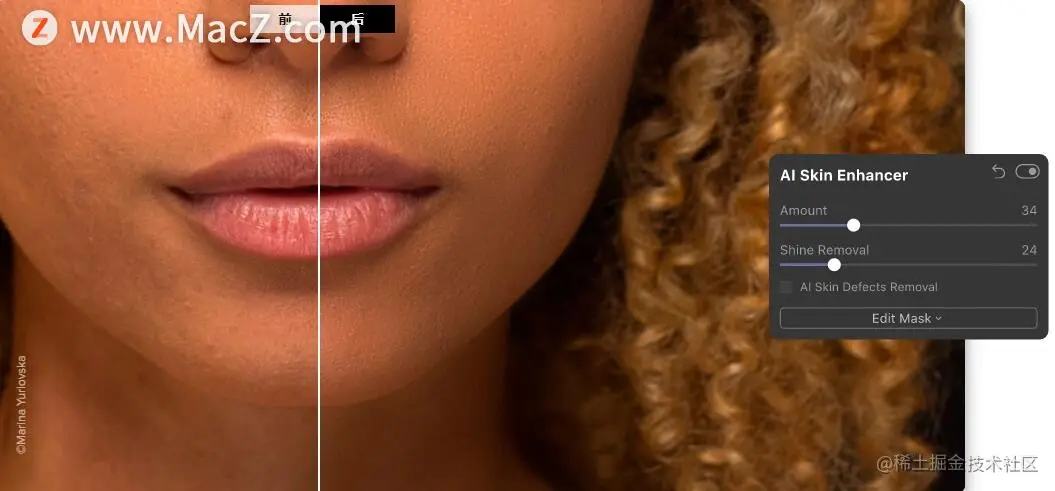 AI Skin Enhancer独特的人类感知技术可发现照片中的所有皮肤(而不仅仅是脸部),将其抚平,消除斑点,同时保留毛孔,质地和头发。一键操作,强度可调。适用于任何年龄和皮肤类型。
