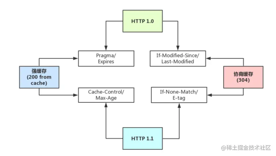 Cache-Control:缓存控制头部,有no-cache、max-age等多种取值Max-Age:服务端配置的,用来控制强缓存,在规定的时间之内,浏览器无需发出请求,直接使用本地缓存,注意,Max-Age是Cache-Control头部的值,不是独立的头部,譬如Cache-Control: max-age=3600,而且它值得是绝对时间,由浏览器自己计算If-None-Match/E-tag:这两个是成对出现的,属于协商缓存的内容,其中浏览器的头部是If-None-Match,而服务端的是E-tag,同样,发出请求后,如果If-None-Match和E-tag匹配,则代表内容未变,通知浏览器使用本地缓存,和Last-Modified不同,E-tag更精确,它是类似于指纹一样的东西,基于FileEtag INode Mtime Size生成,也就是说,只要文件变,指纹就会变,而且没有1s精确度的限制。