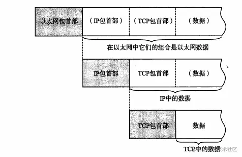 包流动时,从前往后依此被附加了以太网包首部、IP包首部、TCP包首部 (或者UDP包首部)以及应用自己的包首部和数据。而包的最后则追加了以太网包尾