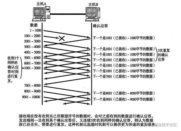 数据接收完毕后,接收端则发送一个“确认回执”给发送端。如果这个回执信息未能达到发送端,那么发送端会认为接收端没有接收到数据而一直反复发送。
