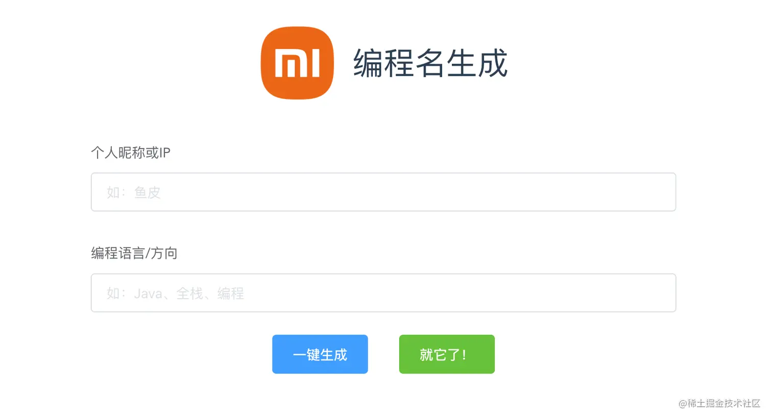 用法很简单,如果你需要强烈的个人 IP,想让名称中带有个人属性,那就只填写第一个输入框,点击一键生成: