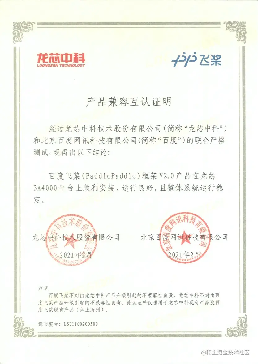 图1:百度飞桨与龙芯中科产品兼容互认证证书