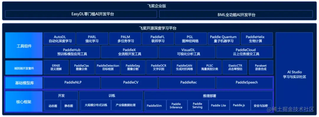 飞桨(PaddlePaddle)以百度多年的深度学习技术研究和业务应用为基础,是中国首个开源开放、技术领先、功能完备的产业级深度学习平台,包括飞桨开源平台和飞桨企业版。飞桨开源平台包含核心框架、基础模型库、端到端开发套件与工具组件,持续开源核心能力,为产业、学术、科研创新提供基础底座。飞桨企业版基于飞桨开源平台,针对企业级需求增强了相应特性,包含零门槛AI开发平台EasyDL和全功能AI开发平台BML。EasyDL主要面向中小企业,提供零门槛、预置丰富网络和模型、便捷高效的开发平台;BML是为大型企业提供的功能全面、可灵活定制和被深度集成的开发平台。
