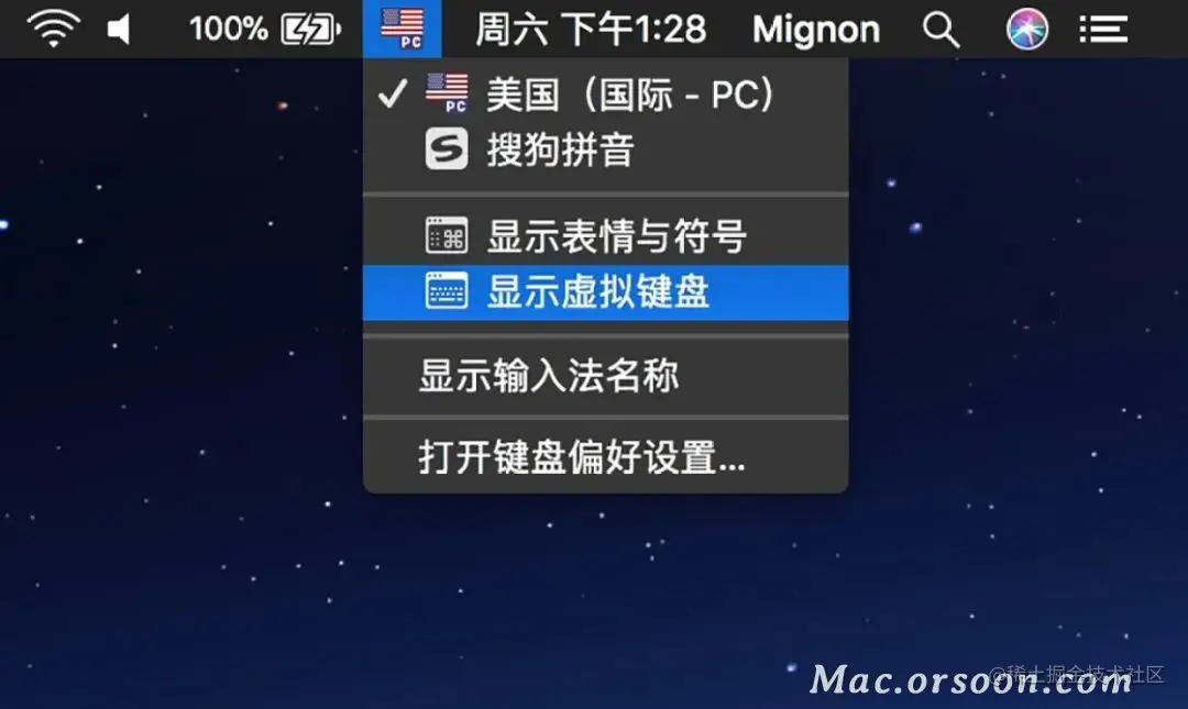 1. 点击菜单栏输入法,再点击显示虚拟键盘(如果没有找到该选项,请看第3步)