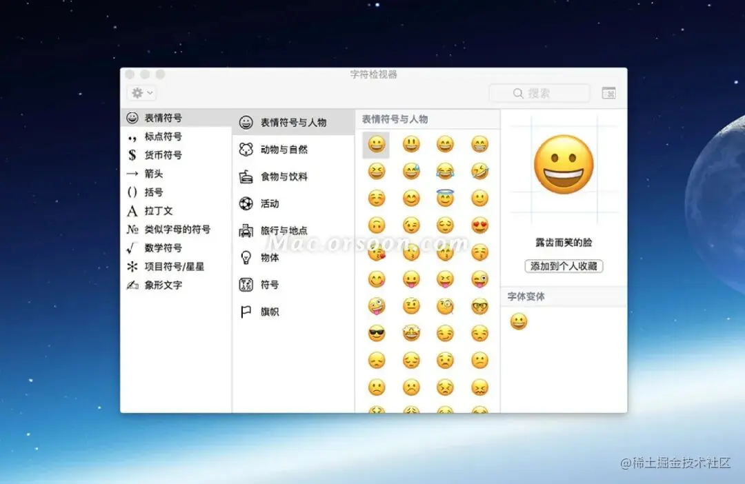 1. 点击菜单栏输入法图标选择「显示表情与符号」,或快捷键 option-command-t,即可打开字符检视器