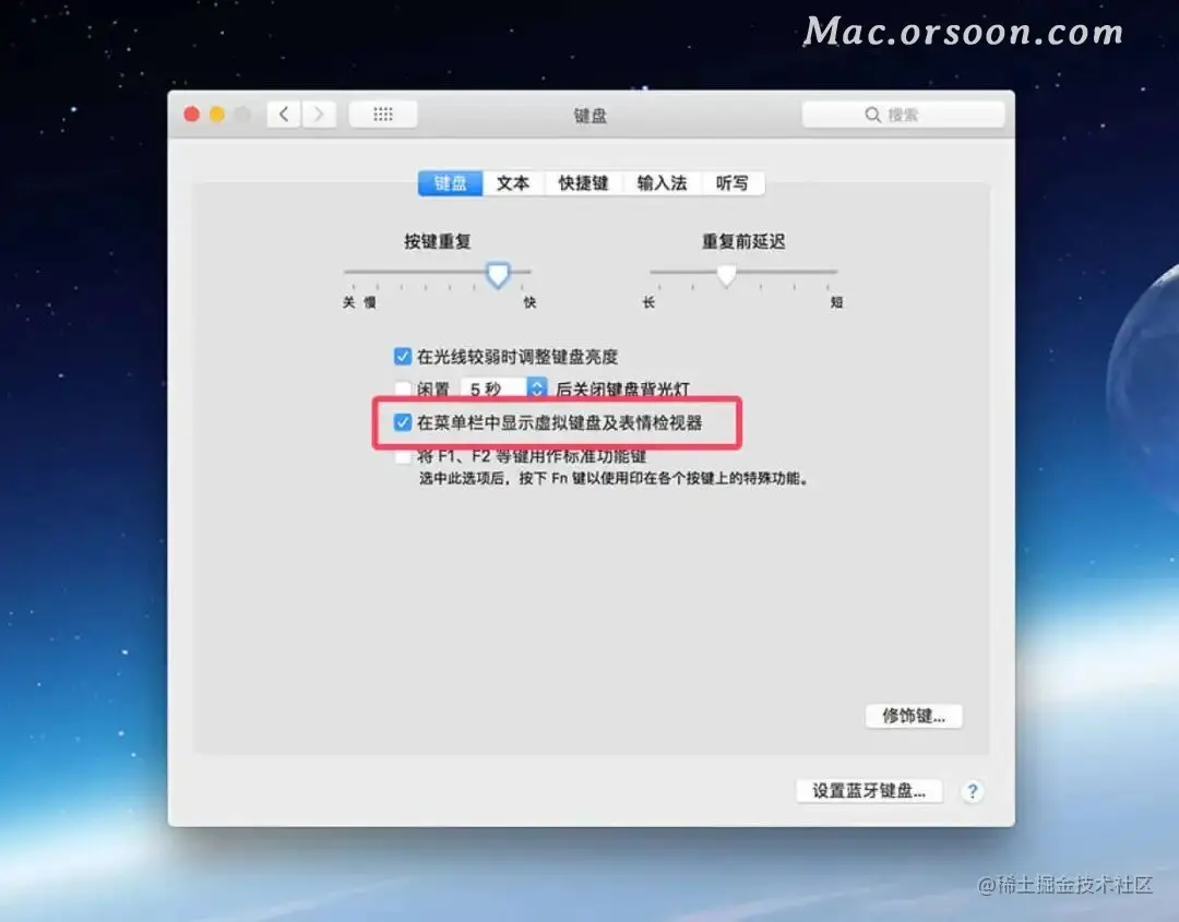 3. 若未找到显示虚拟键盘,打开系统偏好设置,进入键盘标签页,勾选在菜单栏中显示虚拟键盘及表情检视器