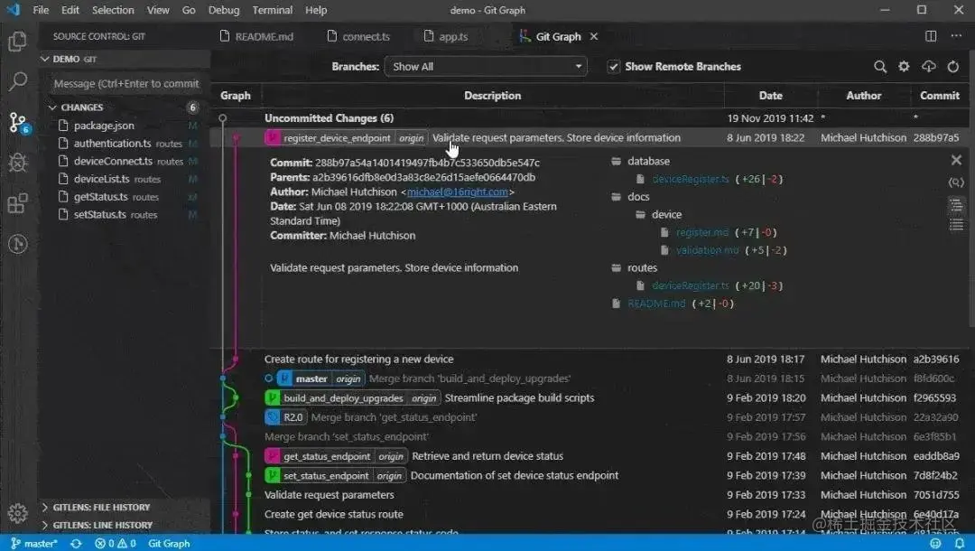 通过这个扩展,可以清楚地看见当前分支的commit记录和变化,可以通过按钮的方式轻易地创建、切换分支、cherry pick、merge等操作。