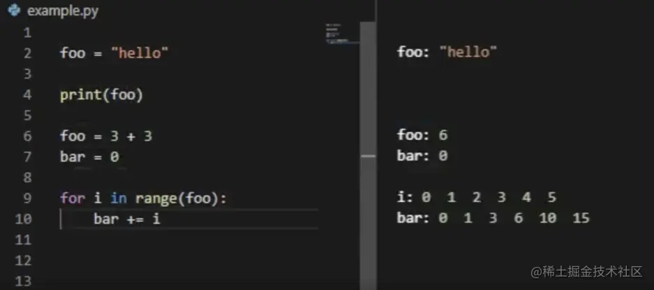 图片就像上图展示的一样,我们不需要执行Python脚本,该插件会实时展示你的每一个变量值,且能够识别print()并自动打印,是不是看上去很舒服,这种交互式的体验对于刚接触Python的同学将会更加友好!