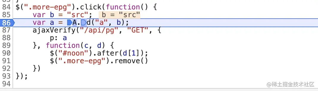 别管其他,带有ajax字样十有八九就是ajax请求了,参数p的值是变量a,在生成变量a的代码处设置断点,点击页面中的"查看更多"按钮触发断点,接着进入A.d()方法: