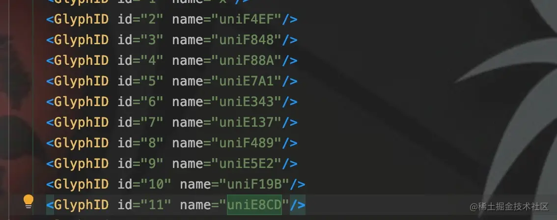 glyph11对应的是id=11的glyph,其对应的name为uniE8CD。接着在xml中找到uniE8CD对应的十六进制: