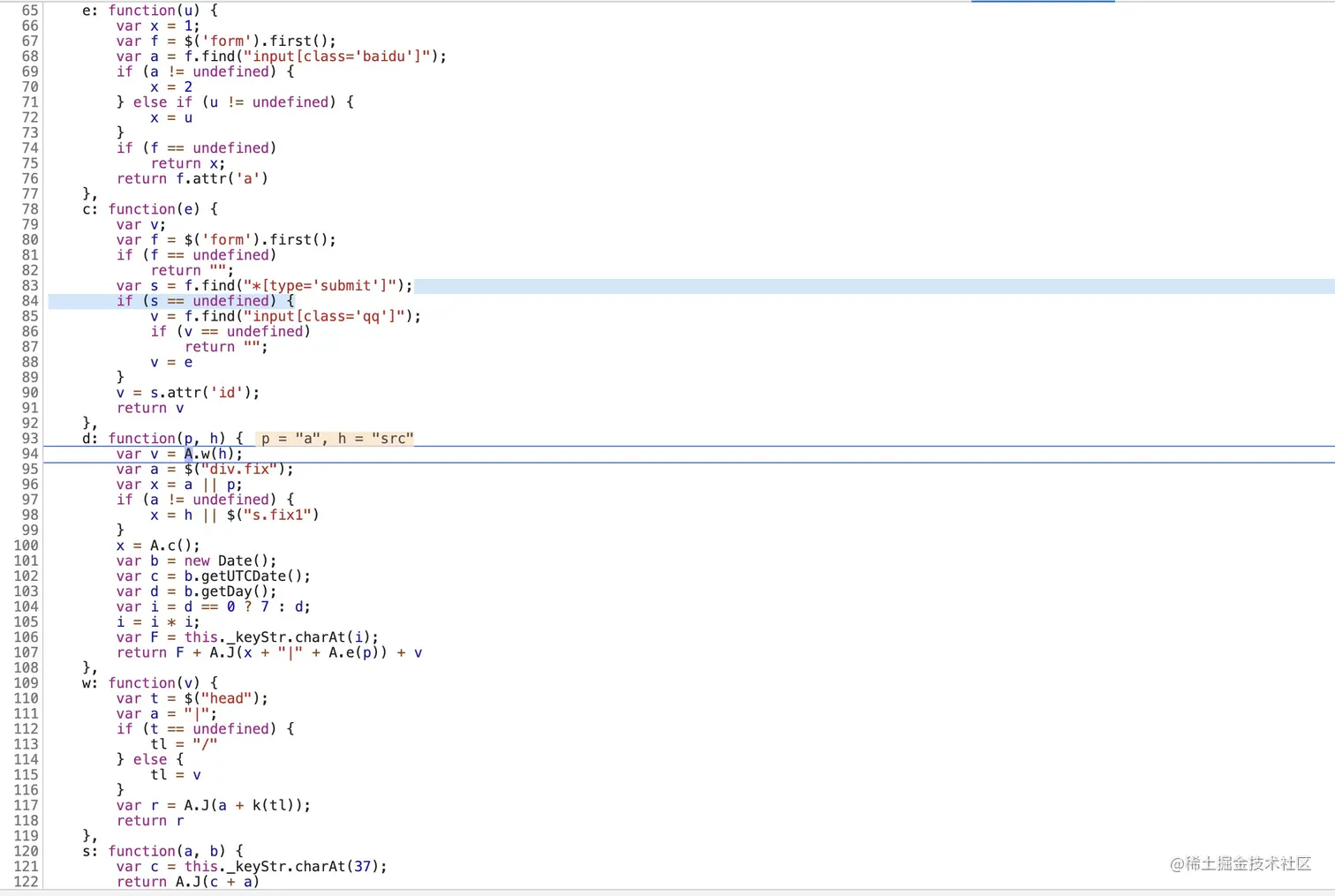 其实到这里就已经可以结束了,你看在d()中又调用了w(),w()也调用了A中其他方法,将这个js中方法调用链搞清楚,将每个方法代码都内联起来,最后计算出参数p,就可以了。