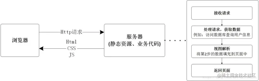 服务端的 servlet 或 controller 接收请求(后端控制路由与渲染页面,整个项目开发的权重大部分在后端)