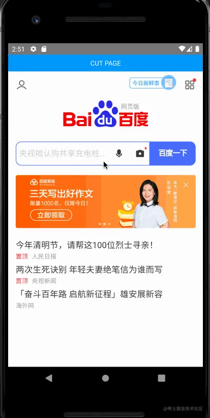 上面我们成功解决了WebView截取完整网页的问题,但是为了更好的满足用户浏览和截取网页的需求,我们不能让用户操作截图的时候,突然放大WebView,这样就很奇怪了,一个投机取巧的方法是,让用于截图的WebView,不让用户感知(隐藏起来),也就是页面其实由两个WebView,用户最终截取全图的WebView被使用样式隐藏起来。