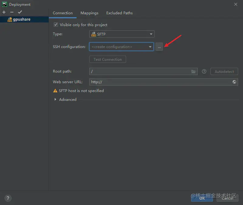 显示测试成功后点 OK 关闭,再点击两次 OK 按钮保存 SSH 配置和 Deployment 配置。