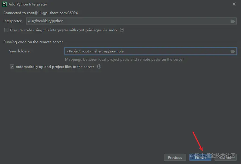 Interpreter 填写 /usr/local/bin/python。选择 Sync folders 设置远程服务器同步目录。