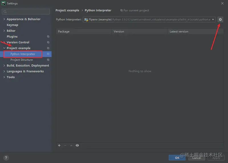 在菜单分类中选择 Project - Python Interpreter,点击右方齿轮图表选择 Add... 。