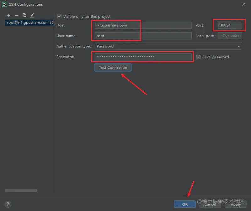 将信息填写在 SSH 配置中,并从 我的实例 中点击复制密码填写到 Password 字段。点击 Test Connection 按钮测试连接。