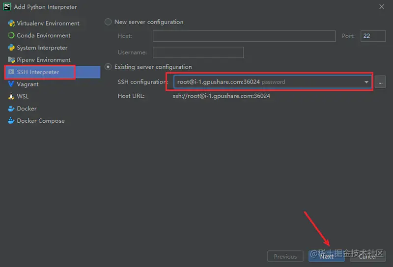 左侧选择 SSH Interpreter。右侧选择 Existing server configuration,选择上一步创建的 SSH 连接。点击 Next。