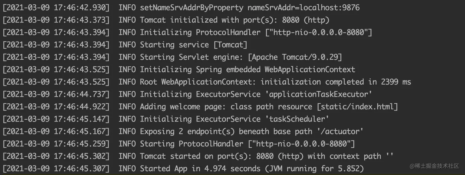 在启动前,我们需要修改下application.properties的配置,找到rocketmq.config.namesrvAddr配置,添加nameServer的ip与端口,这里我们连接的是本地应用,直接填写localhost:9876: