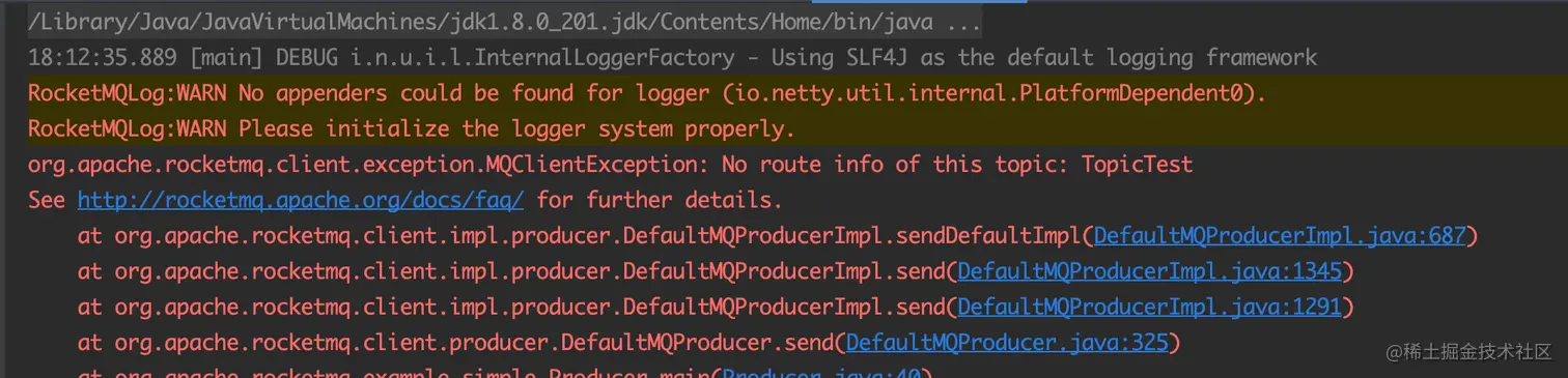 这表明当前broker中没有TopicTest的topic,这时我们可以手动创建topic,也可以在启动时指定autoCreateTopicEnable=true.