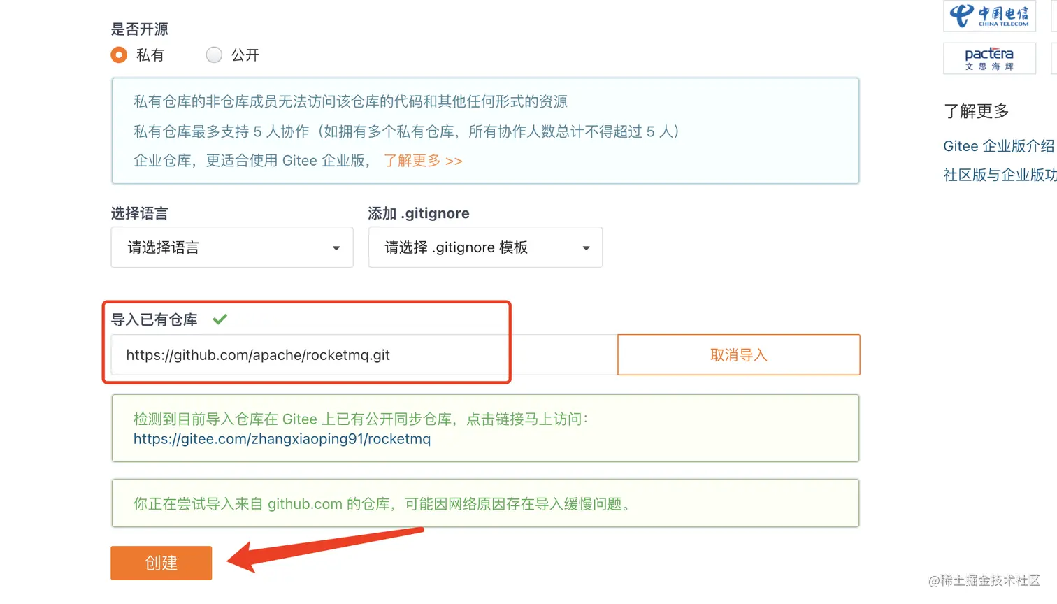 rocketMq项目的github仓库为github.com/apache/rock…,由于网络原因,我们并不会直接使用github仓库,而是将其导入到gitee上,只需在gitee创建新仓库时,选择导入已有仓库即可: