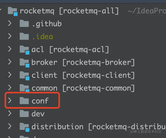 在启动项目前,我们需要进行一些配置,rocketMq项目的配置文件位于rocketmq/distribution模块下的conf目录中,直接整个复制到rocketmq目录下: