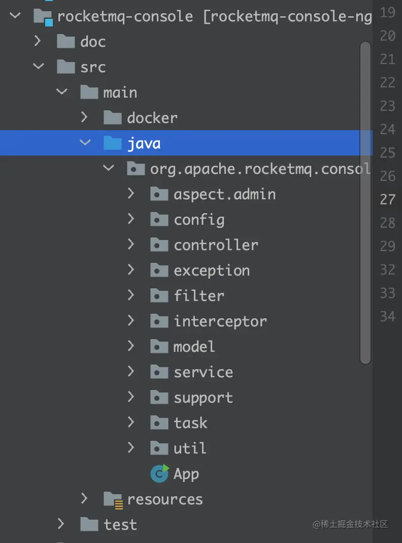 管理后台项目为rocketmq-console,主类为org.apache.rocketmq.console.App:
