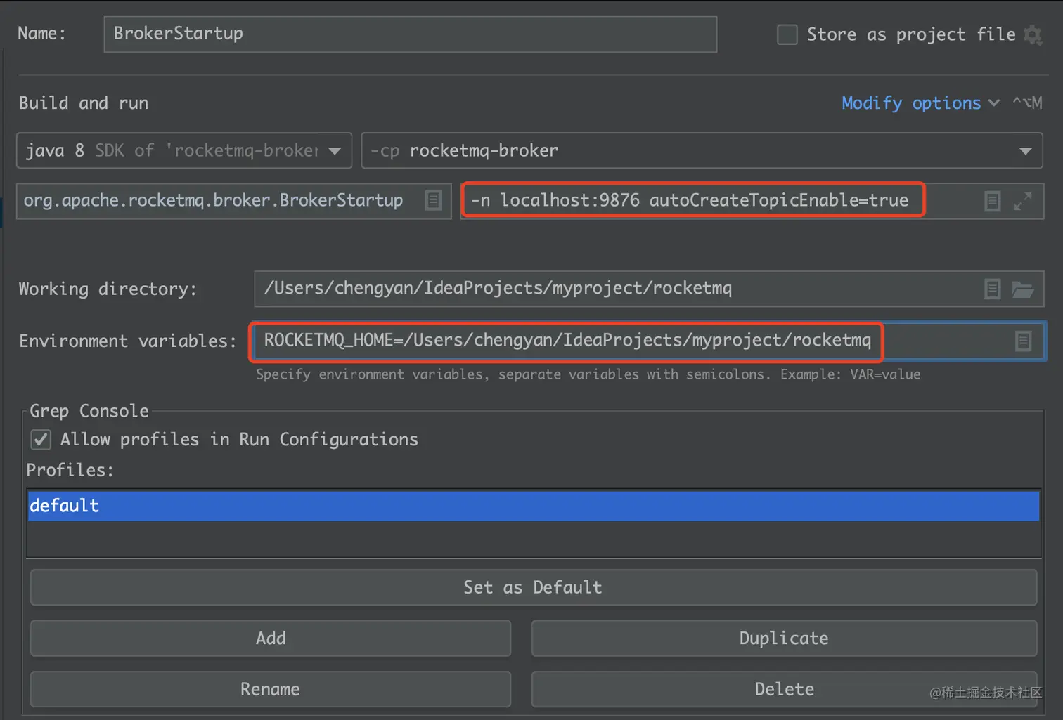 这里我填写的是ROCKETMQ_HOME=/Users/chengyan/IdeaProjects/myproject/rocketmq,这个ROCKETMQ_HOME路径就是conf文件夹所在的目录。