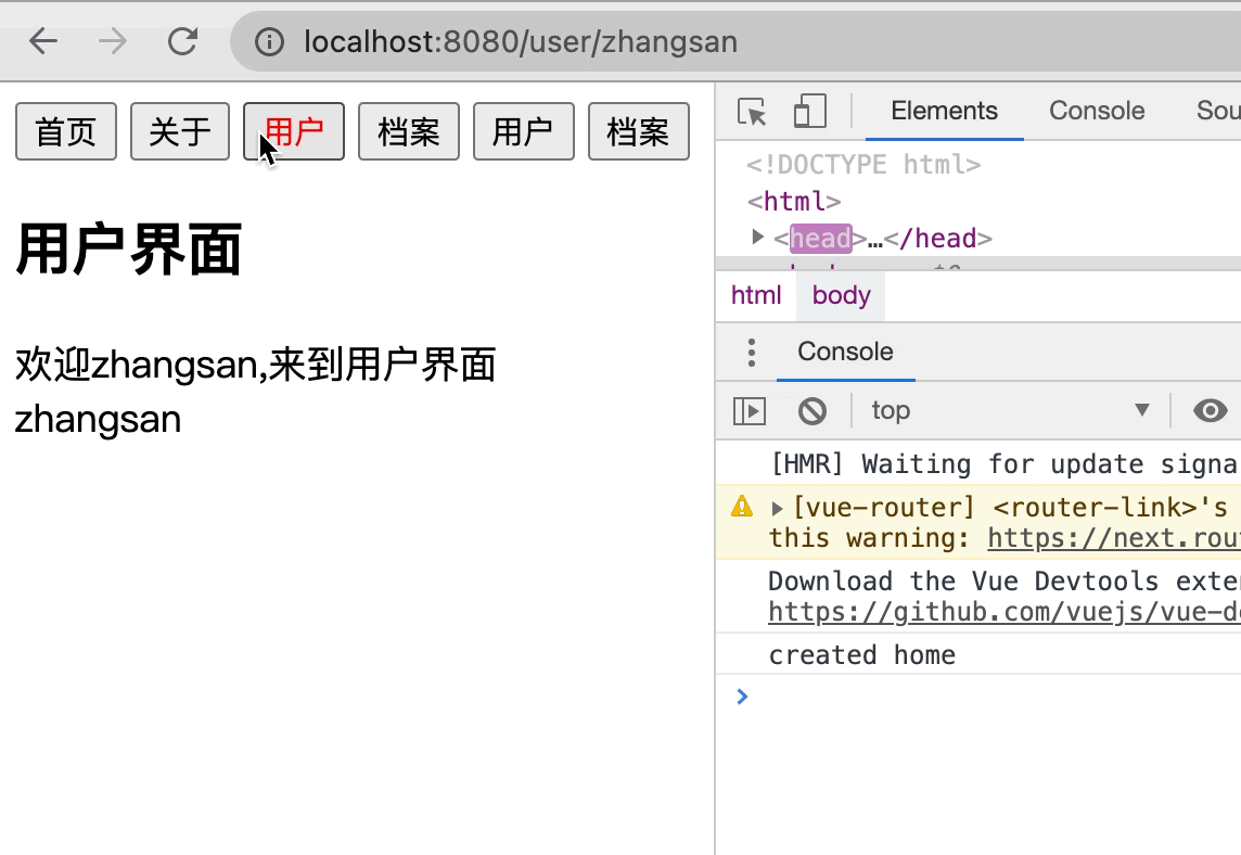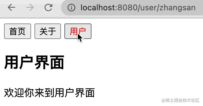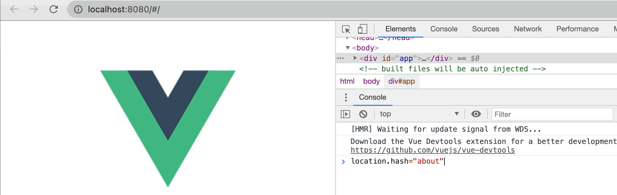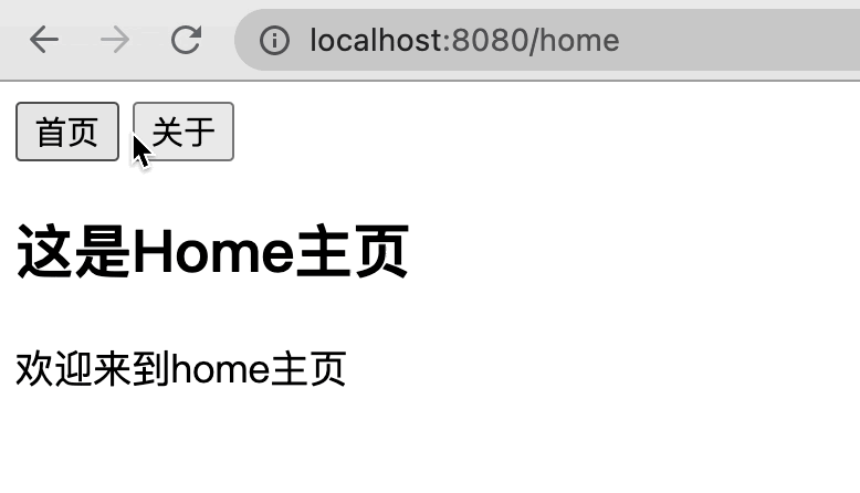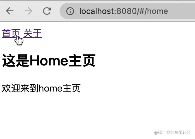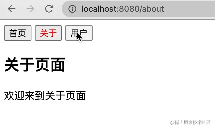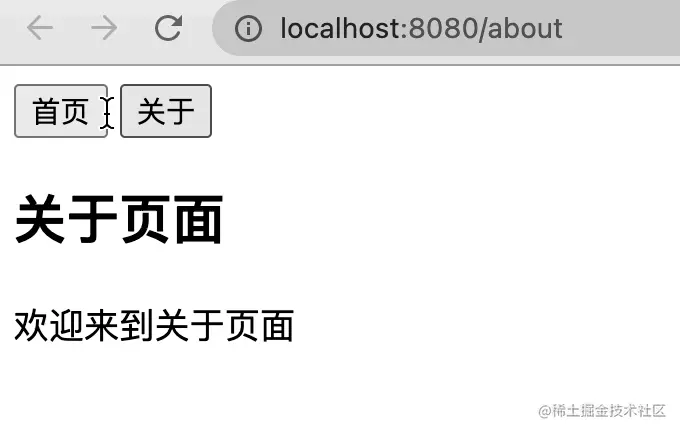 在浏览器控制台输入localhost.hash="about", 我们可以看到页面链接变成了localhost:8080/#/about/