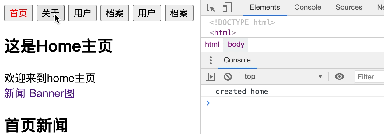 我们看到只有第一次创建了home组件, 后来路由调走, 组件并没有被销毁.