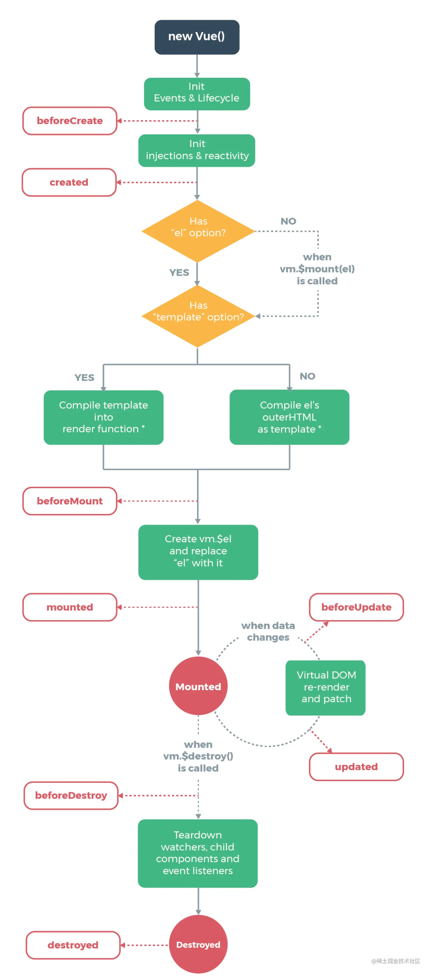 如上图所示:在vue整个生命周期, 他有很多挂载函数, 比如:beforeCreate(创建组件之前), created(创建组件后), beforeMount(挂载组件之前), mounted(挂载组件之后), beforeUpdate(组件值更新之前),updatd(组件值更新之后),beforeDestroy(组件销毁之前),destroyed(组件销毁之后)