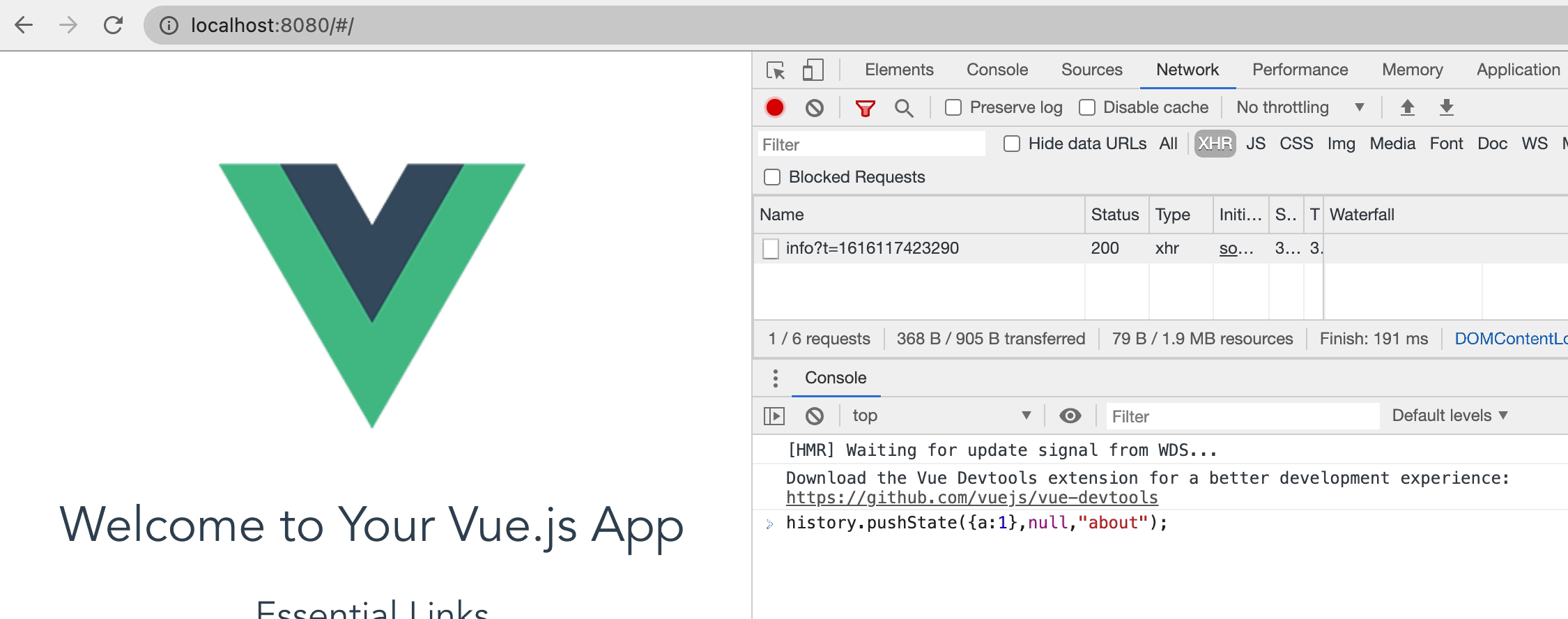 如上图所示: 当我们执行history.pushState({a:1},null,"about");的时候, 浏览器并没有刷新页面(Network没有请求), 但是url链接确实发生了变化
