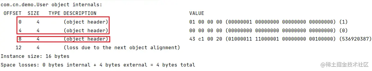 System.out.println(ClassLayout.parseInstance(user).toPrintable());