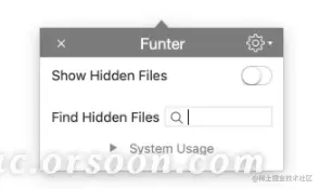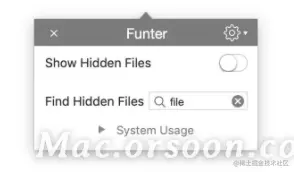 启动 Funter后,您会在菜单栏中找到其图标。单击图标,然后在 Funter 窗口中切換到“显示隐藏的文件”。