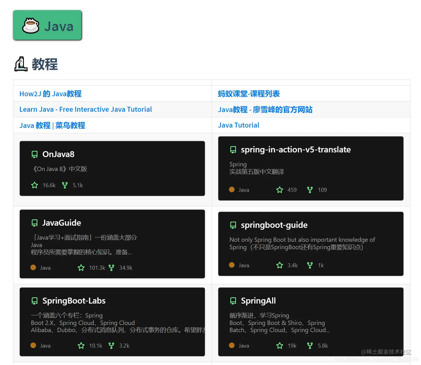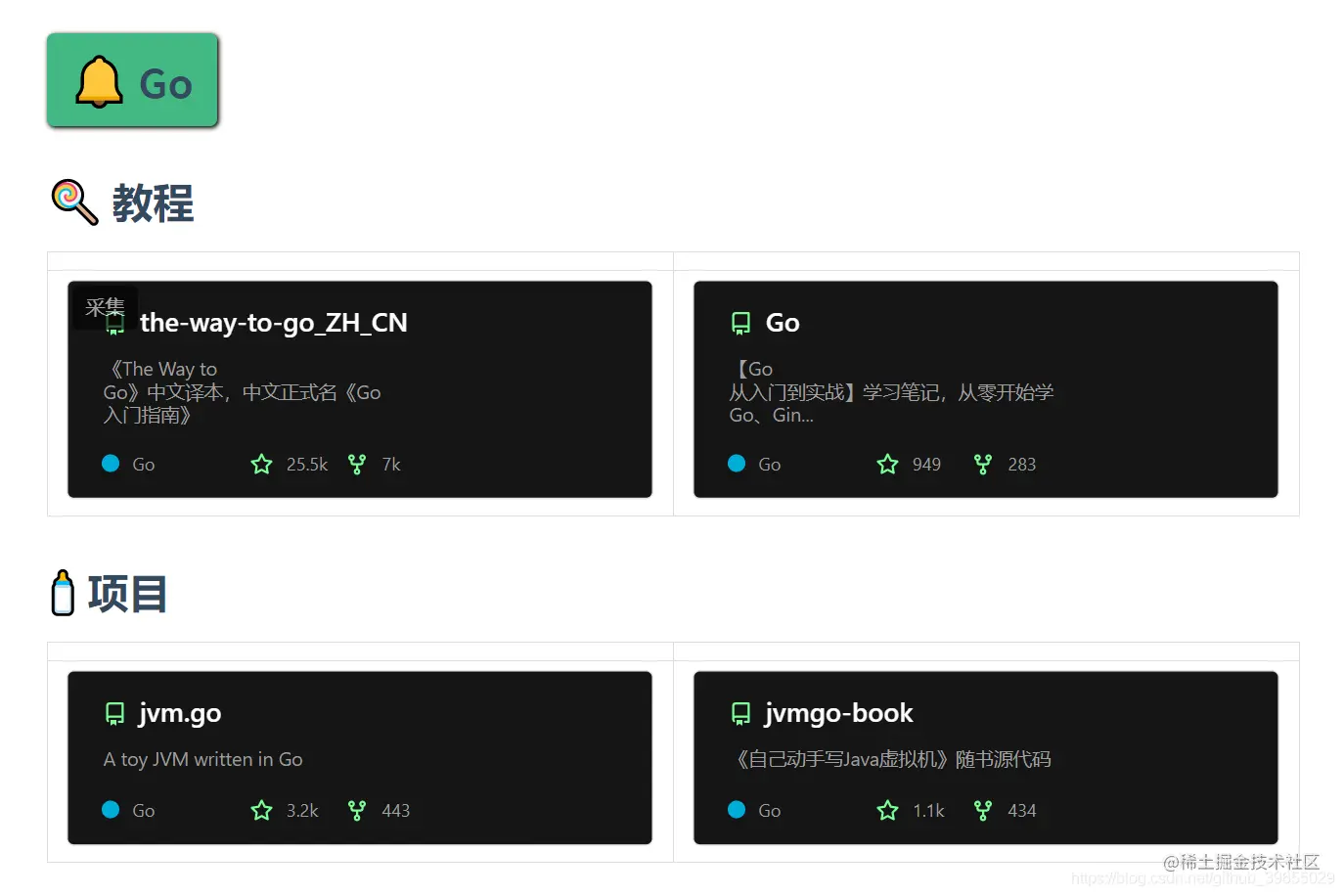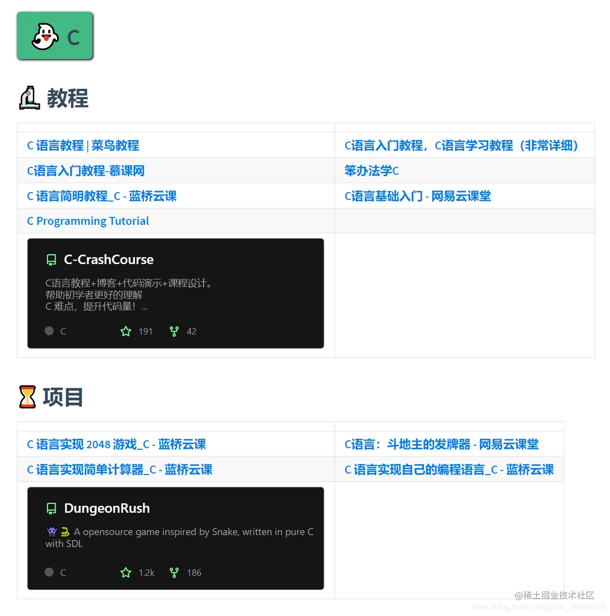 然后在具体的语言大类中,又拆分出了 教程 和 项目 两个子类。教程中主要包括学习该语言的一些教程或者知识点总结,而项目则主要针对学习改语言之后进行实战环节,两部分搭配使用起来更香哦。下面就来给出各个部分中的部分资源,拭目以待吧!
