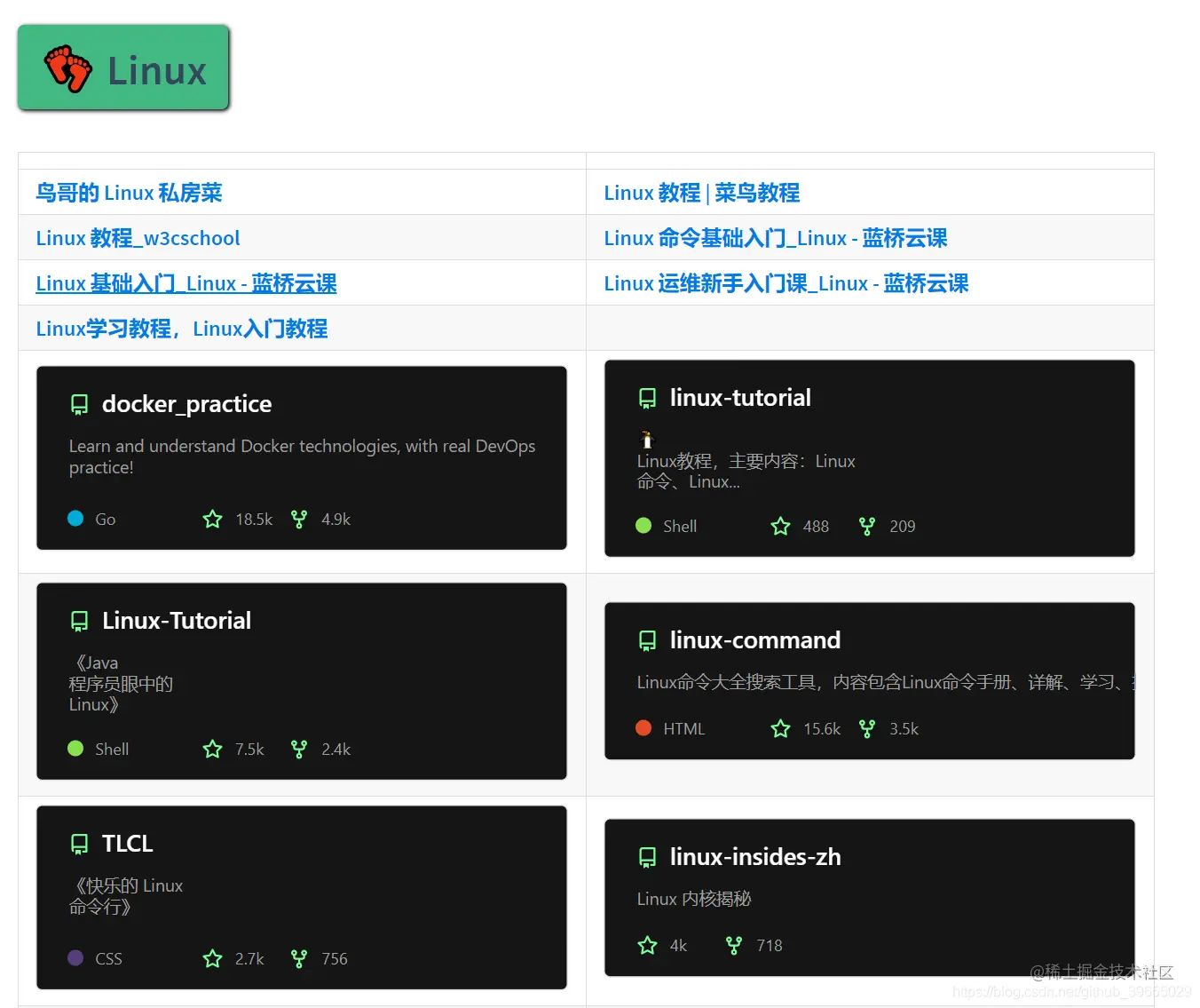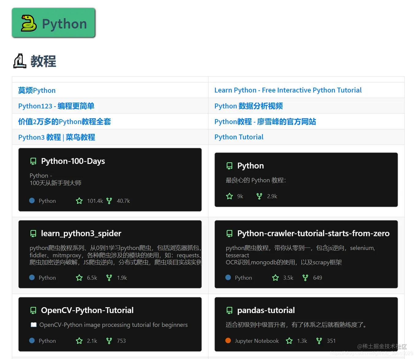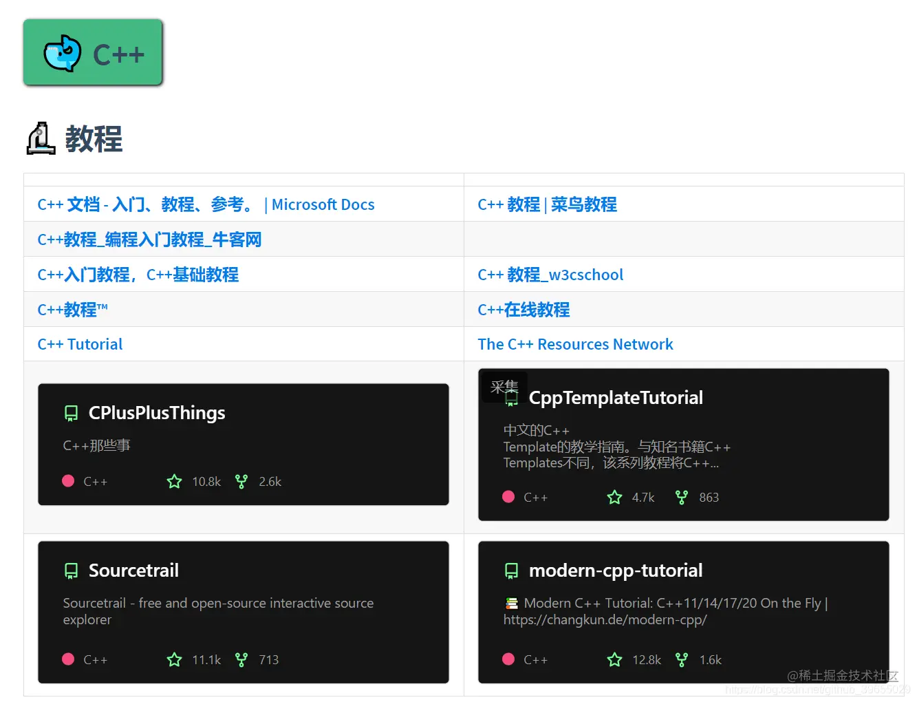 然后在具体的语言大类中,又拆分出了 教程 和 项目 两个子类。教程中主要包括学习该语言的一些教程或者知识点总结,而项目则主要针对学习改语言之后进行实战环节,两部分搭配使用起来更香哦。下面就来给出各个部分中的部分资源,拭目以待吧!