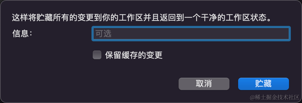 我们如果有些功能还没做好,但又想要拉服务器的代码,自己代码不提交就可以选择用 贮藏。它会我们更改的内容放到一个干净的工作区。