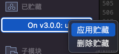 等我们拉取代码后,就可以在 已贮藏 中,选择应用贮藏, 把代码拉回到我们的当前选择的分支中。