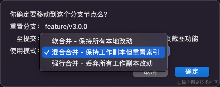 这里会把当前选择的提交的历史操作以上都会回滚,如提交了版本1, 版本2,版本3,版本3是最新的。这时候选择重置到版本1,那么版本2,3是会回滚到本地。