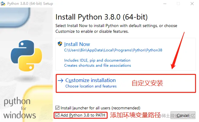 - 开始安装,选择自定义安装,同时添加环境变量路径