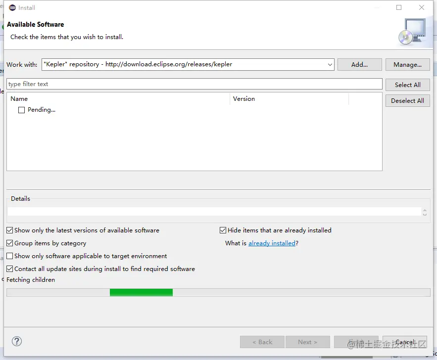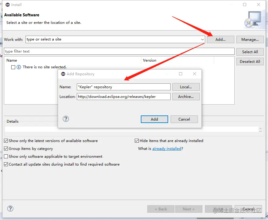 点击右边的Add,然后Name是"Kepler" repository,Location是download.eclipse.org/releases/ke…