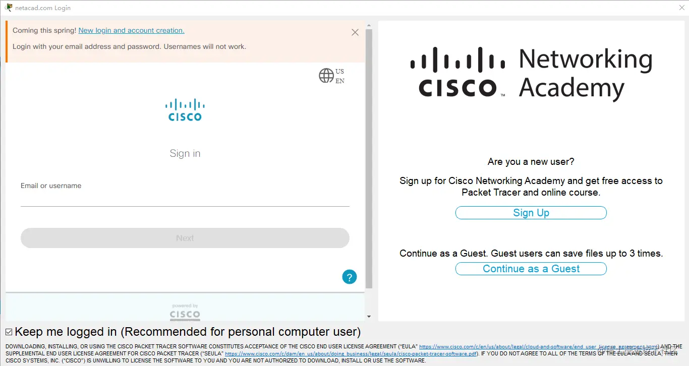 - 然后进入如下的登陆界面,我们输入思科网络学院账号和密码,如果还没有账号,可自行注册