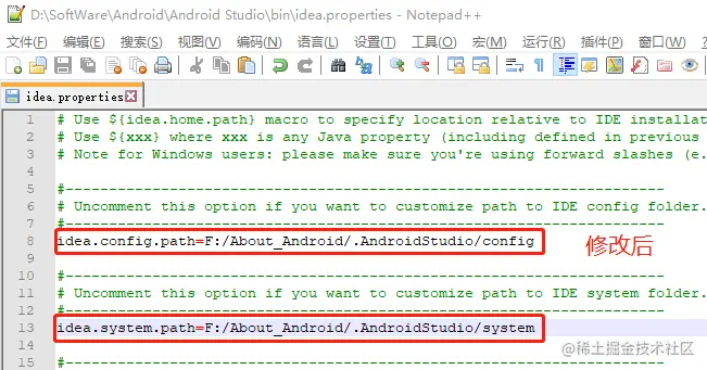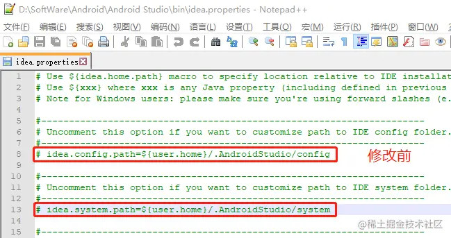 进入AS的安装目录下的bin中,然后编辑idea.properties文件,修改下面的配置,修改成你相对应的位置