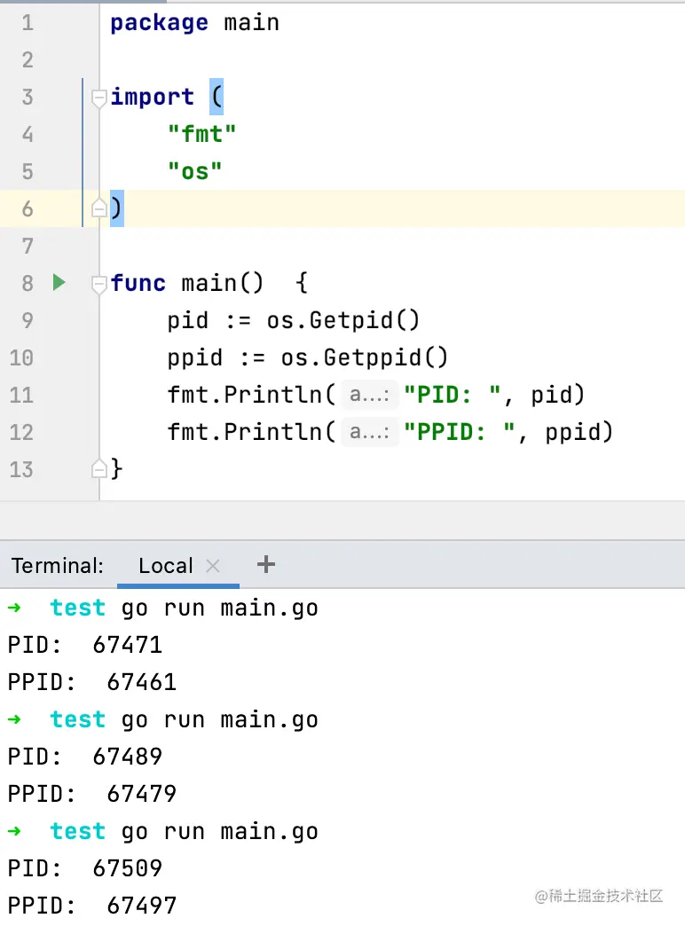 可以通过 Go 的标准库代码包 os 查看当前进程 ID 以及 PPID,可以从结果看,每次进程 ID 总是前一个进程 ID 递增的结果。