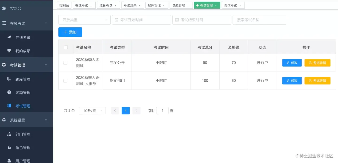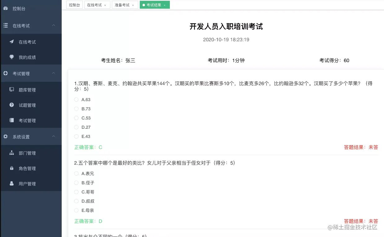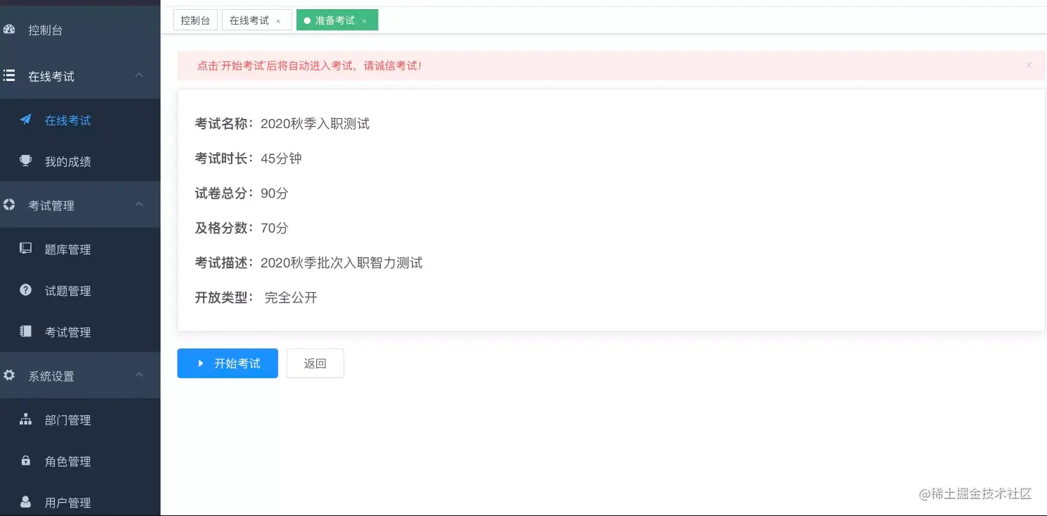 - 管理端:题库管理、试题管理、考试管理、用户部门管理、查看考试情况等等。